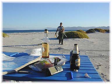 | Die unerträglich schwere Arbeit ist an jedem Strand die gleiche - erstmal 'n Bier und dann Holz fürs Lagerfeuer sammeln |
